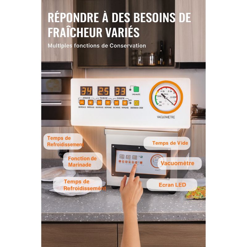 Grâce à son moteur puissant de 1 700 W et son vide maximal de -100 KPa, elle garantit un effet sous vide d’une qualité exceptionnelle, préservant la fraîcheur, la texture et le goût de vos préparations.